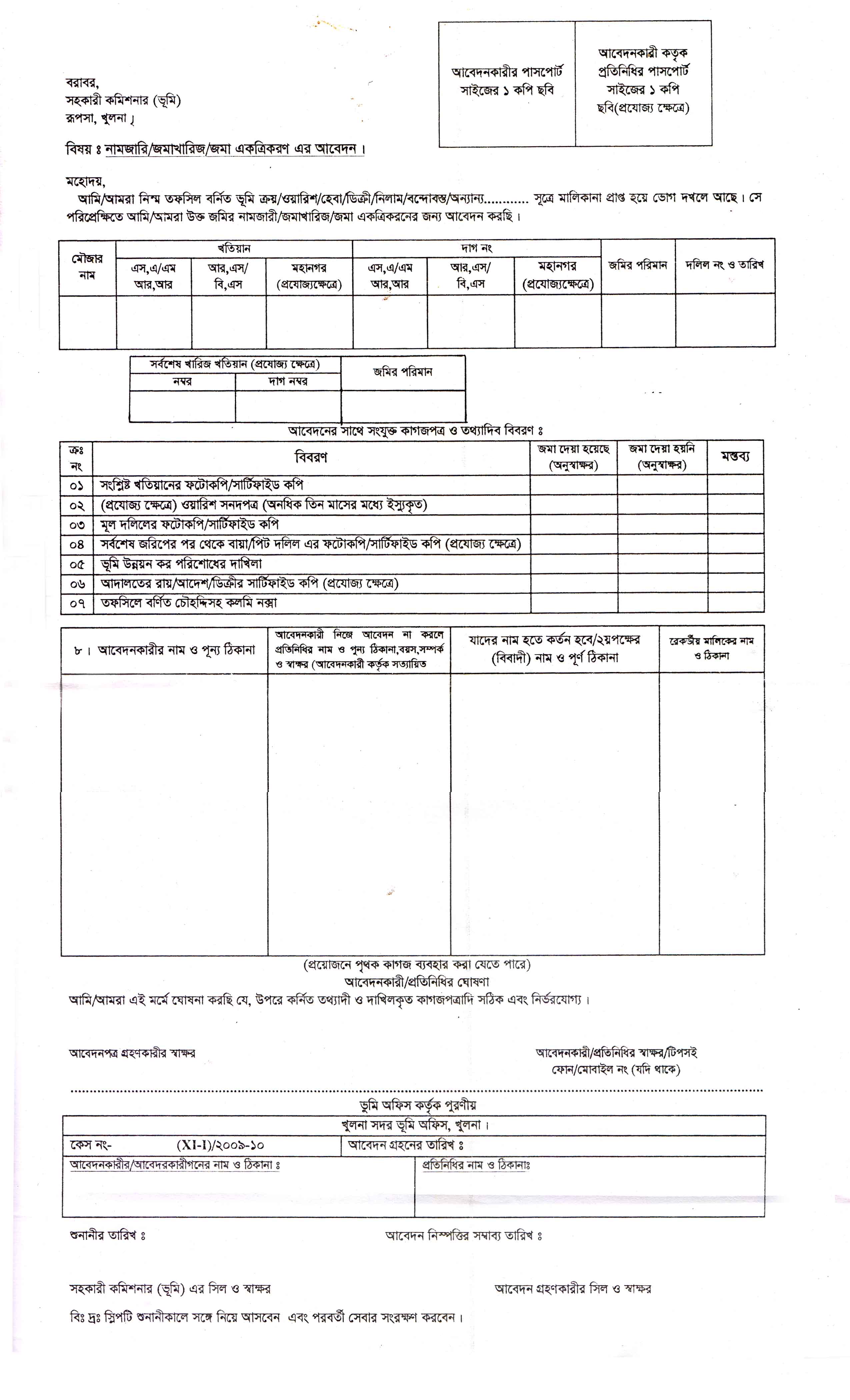 খ) খাস জমি বন্দোবস্তো ফরম অংশ ১+ অংশ ২